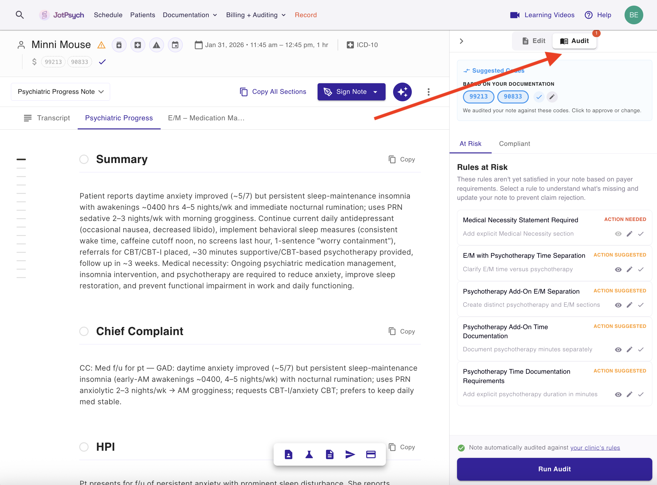 If you don’t select a CPT code, JotAudit recommends one based on your documentation.