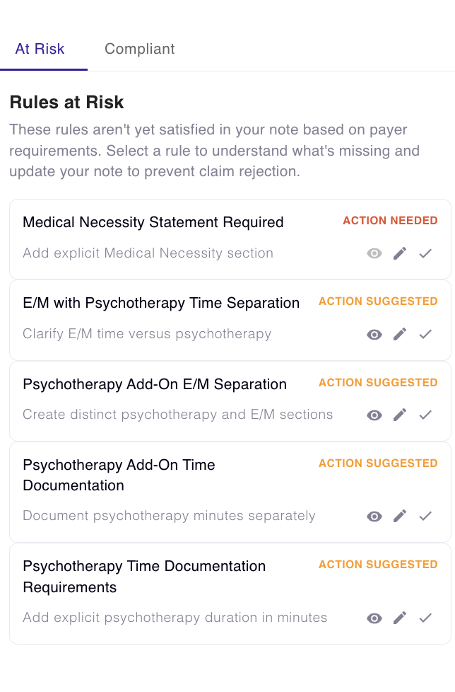 JotAudit applies the rules that are relevant to your note based on the CPT context, then scans your documentation to identify where support may be missing.