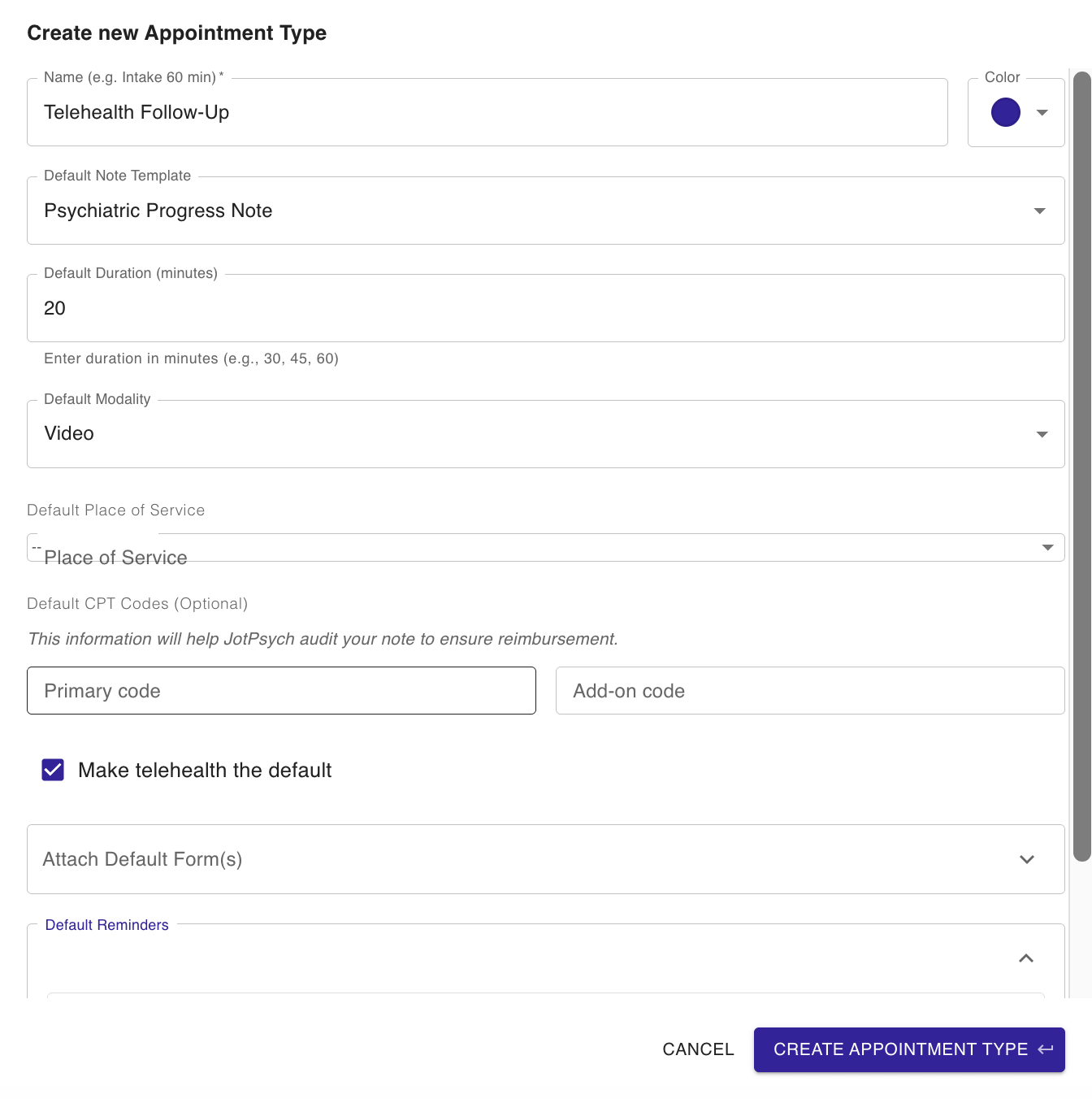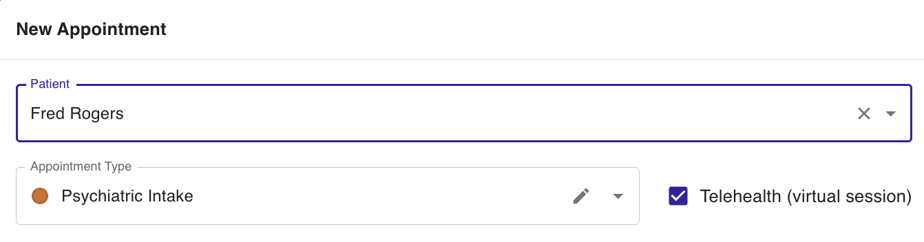 This is especially helpful if most or all of your sessions are virtual.[Screenshot placeholder: New appointment form with telehealth checkbox highlighted]