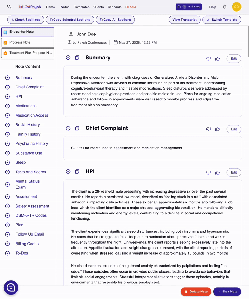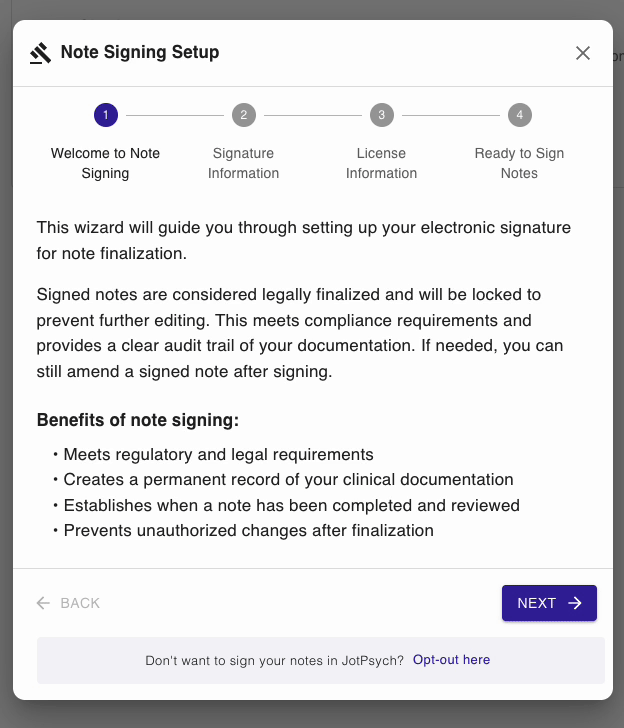 JotPsych now supports note signing, allowing you to finalize a version of your note for compliance or record-keeping — while still giving you flexibility to make future edits.